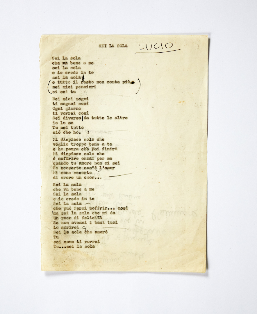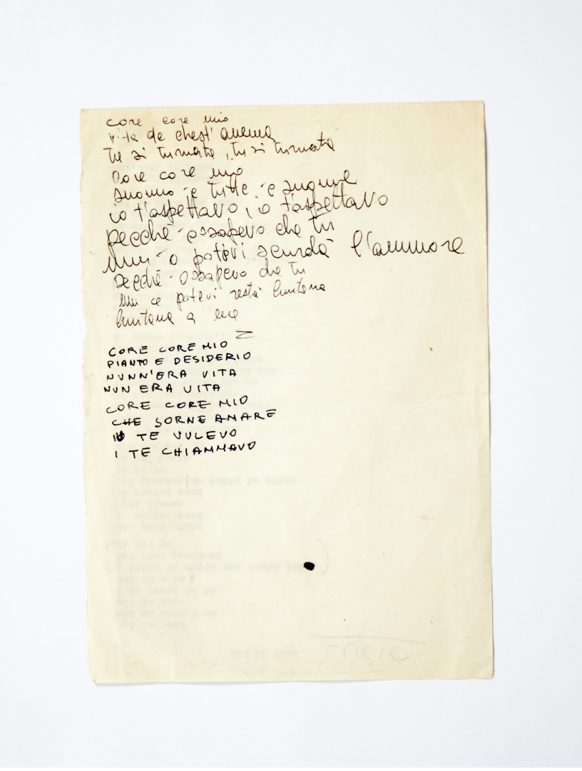 Versione italiana di "Oh Pretty Woman" di Roy Orbison. Testo preparato da Battisti e scritto da lui a macchina. Sul retro, testo scritto a mano di "Core core mio", l'unica canzone che Battisti e Matano hanno scritto in napoletano, mai registrata. La prima parte in corsivo è scritta da Matano, la seconda, in stampatello, l'aveva aggiunta Battisti