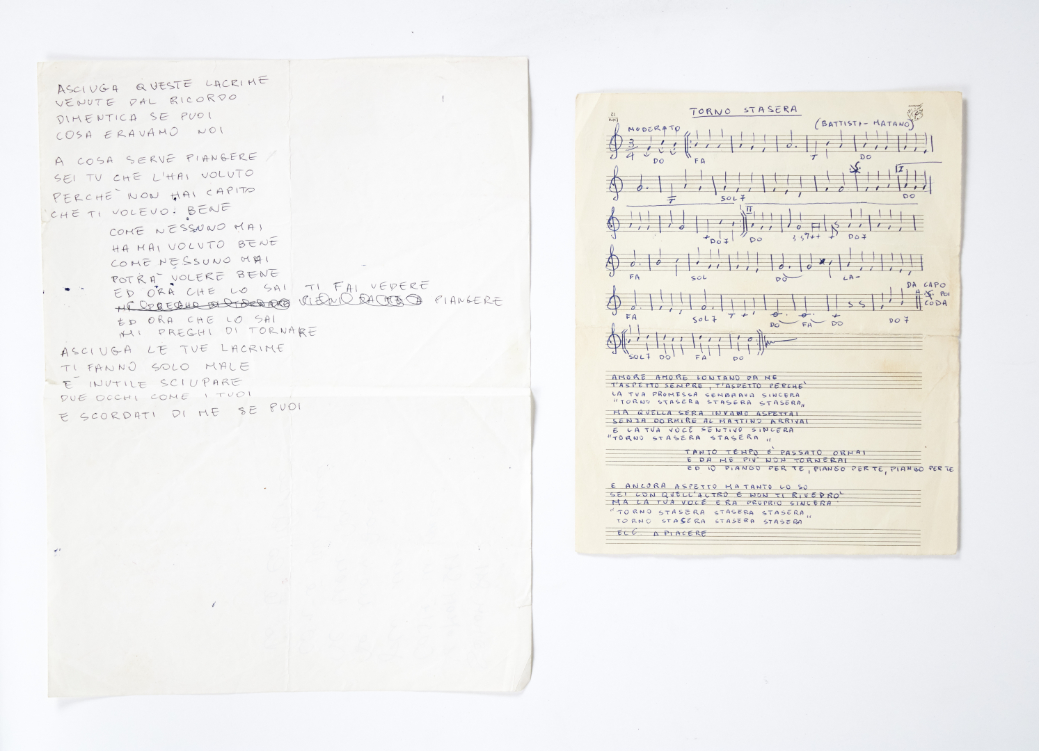 Oltre a manoscritto originale  contenente il testo di "Aciuga le tue lacrime" composta da Battisti e Matano, cantata dai Profeti