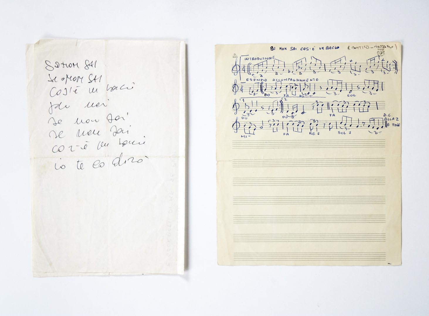 Eccezionale lotto con da un lato lo spartito originale di "Se non sai cos'è un bacio", prima canzone che Battisti e Matano hanno considerato finita. Da questo brano è nata nel 1966 "Uno in più" con il testo di Mogol, portata al successo da Riki Maiocchi. Dall'altro "Torno stasera", canzone scritta al ritorno dalla prima tournée dei Campioni in Nord Europa alla fine del 1964