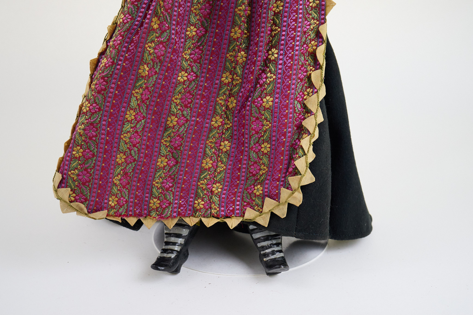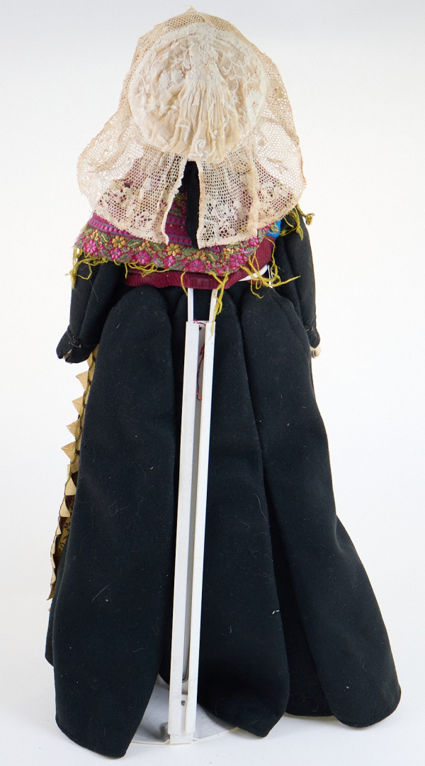 con occhi di vetro, su corpo in tessuto con composizione avambracci e gambe ricoperte di cera, stivaletti modellati, vestito originale.