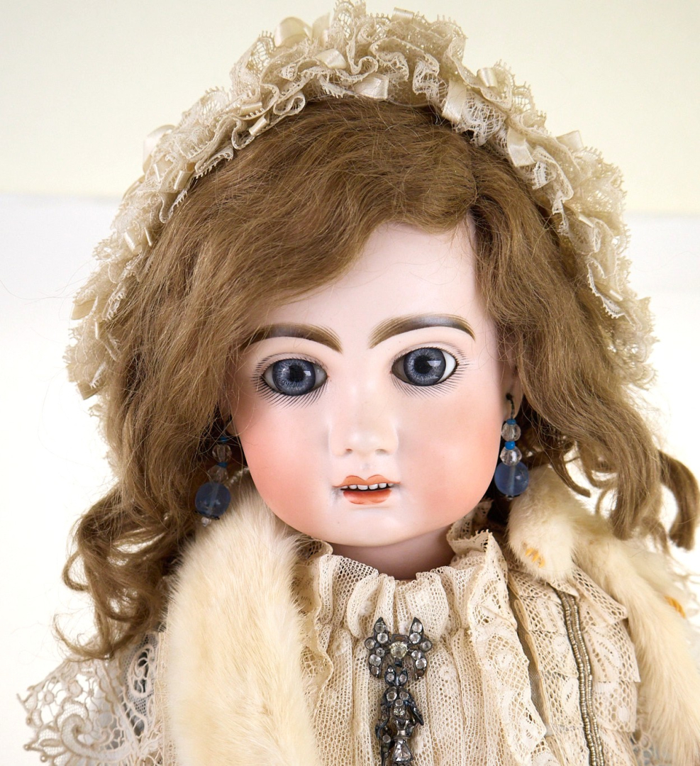 testa bisquit, corpo di composizione originale, occhi blu Paperweight, bocca aperta, parrucca originale, vestiti nuovi.