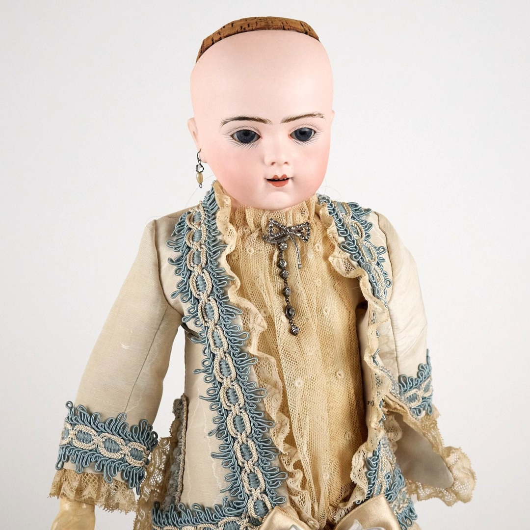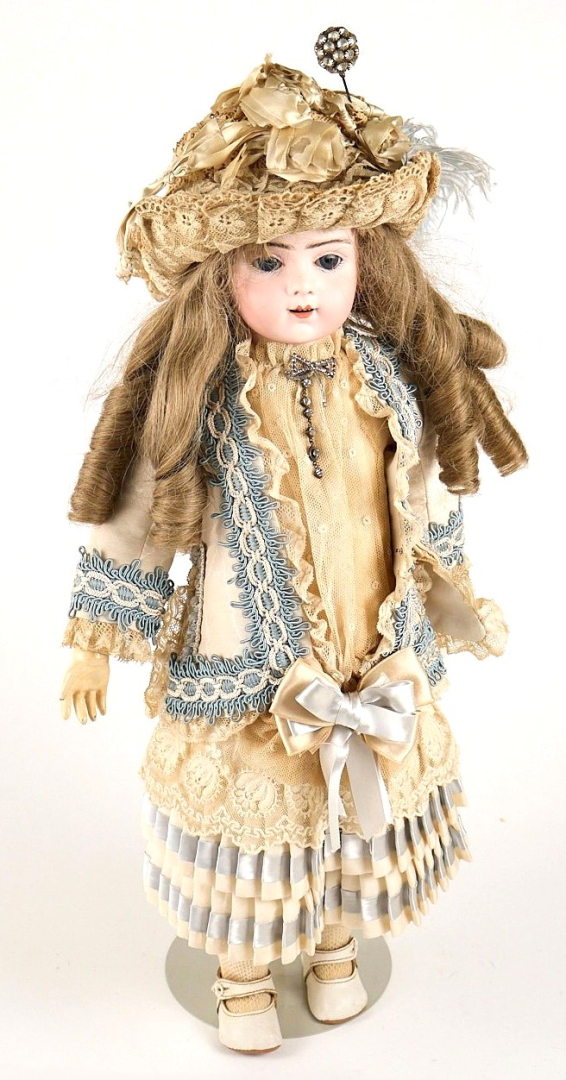contrassegnata R9, testa di porcellana, occhi di vetro, bocca aperta, corpo francese, vestiti nuovi, parrucca non originale.
