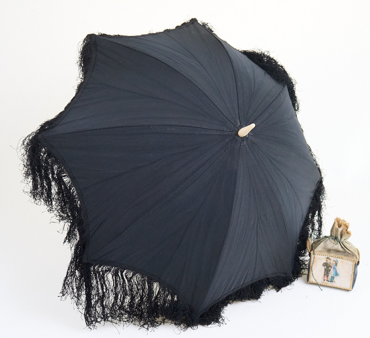 in biscuit, vestiti e accessori originali, con ombrello Verdier.