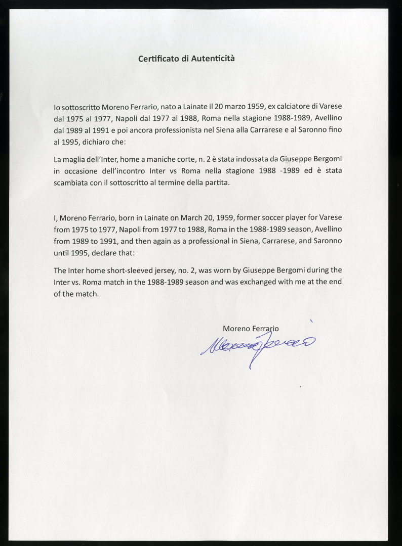 Maglia indossata da Bergomi in occasione dell’incontro Inter vs Roma (2-0) del 30 ottobre 1988 disputatosi allo stadio San Siro di Milano e scambiata a fine partita con l’avversario Moreno Ferrario.