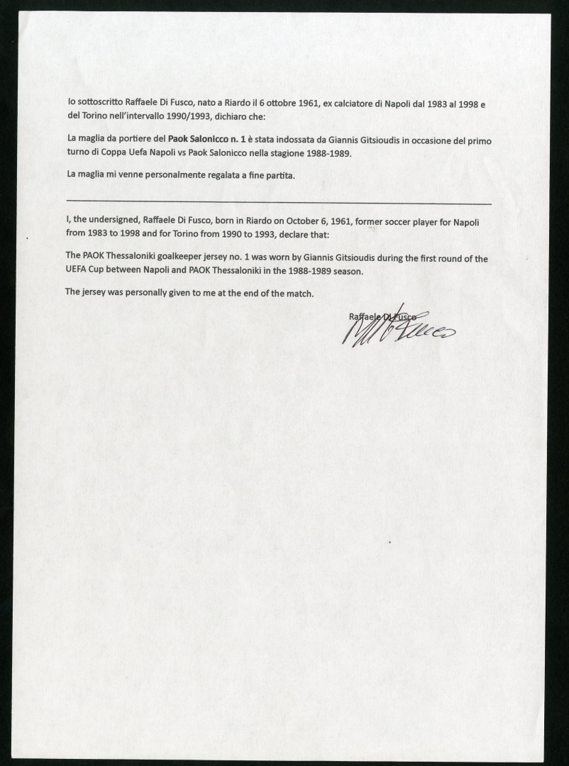 Maglia indossata da Gitsiudis in occasione dell’incontro di Coppa Uefa Napoli vs Paok Salonicco (1-0) del 7 settembre 1988 disputatosi allo stadio San Paolo di Napoli e scambiata a fine partita con l’avversario Raffaele Di Fusco.