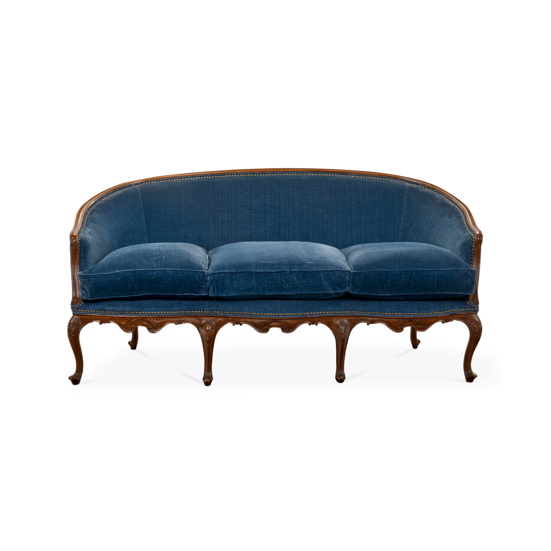 Legno intagliato e curvato, le gambe mosse con intagli alternati a decori di conchiglie, rivestimento in velluto blu.