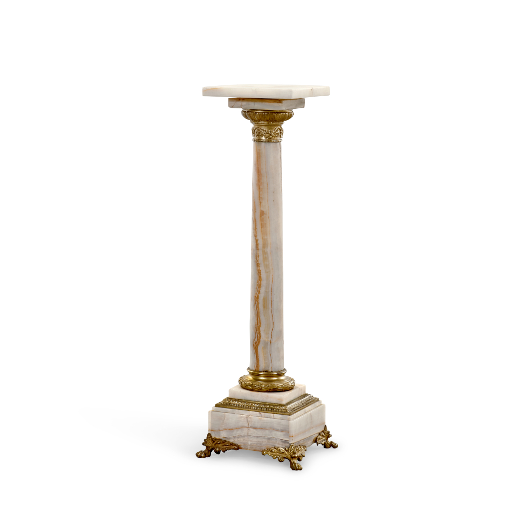 Marmi, alabastro e bronzo dorato, su base quadrangolare con quattro piedi ferini.