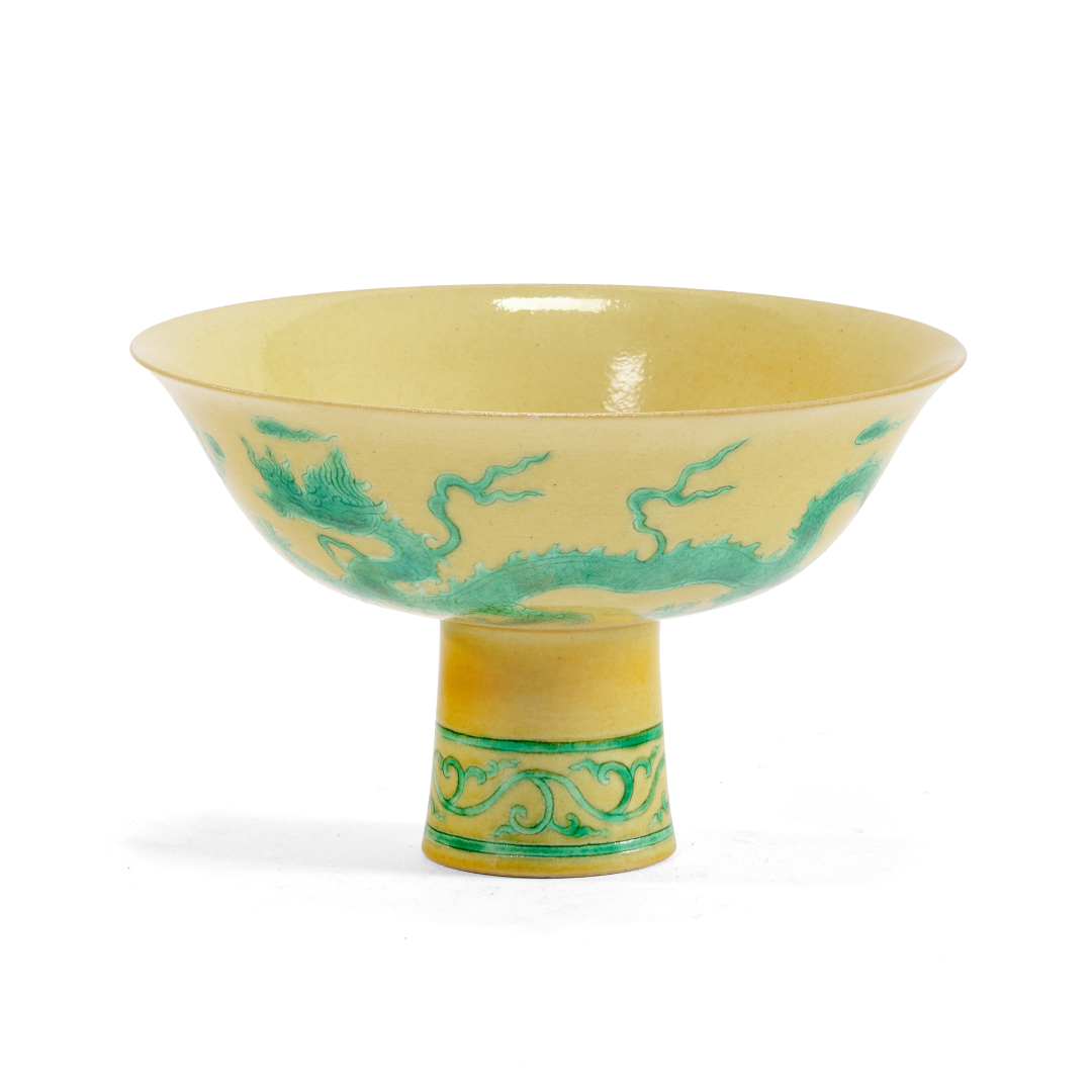 Porcellana con invetriatura fondo giallo e decoro di draghi a smalto verde inciso, marchio apocrifo di Zhengde all'interno della base.