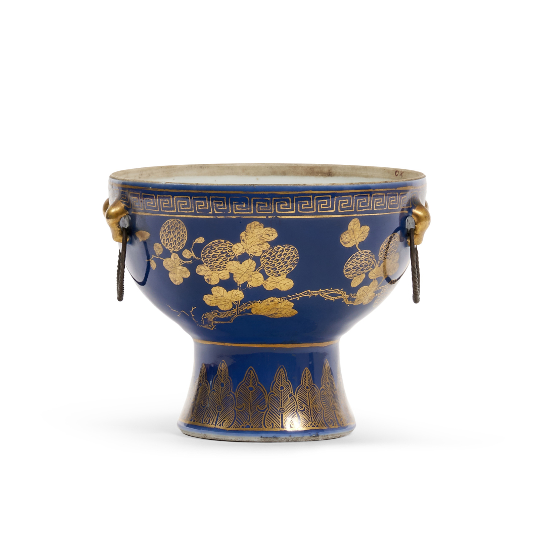 Porcellana con invetriatura blu sull'esterno, sulla quale si dispone decoro di frutti, fregio geometrico e foglie stilizzate a oro, marchio di Guangxu al centro della base.