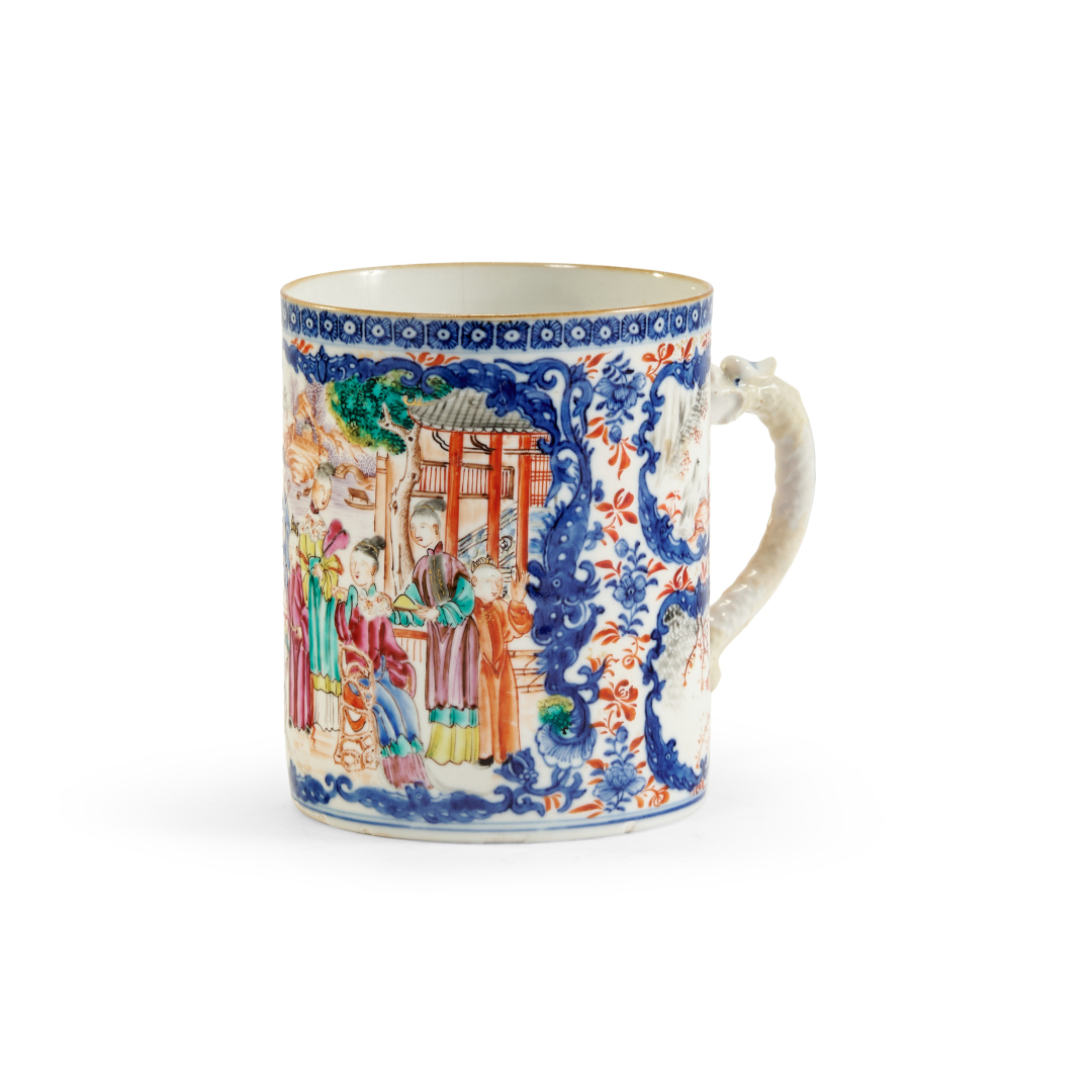 Porcellana dipinta a smalti policromi, decoro di composizioni di fiori e uccelli e figure entro cartigli, presa modellata a drago.