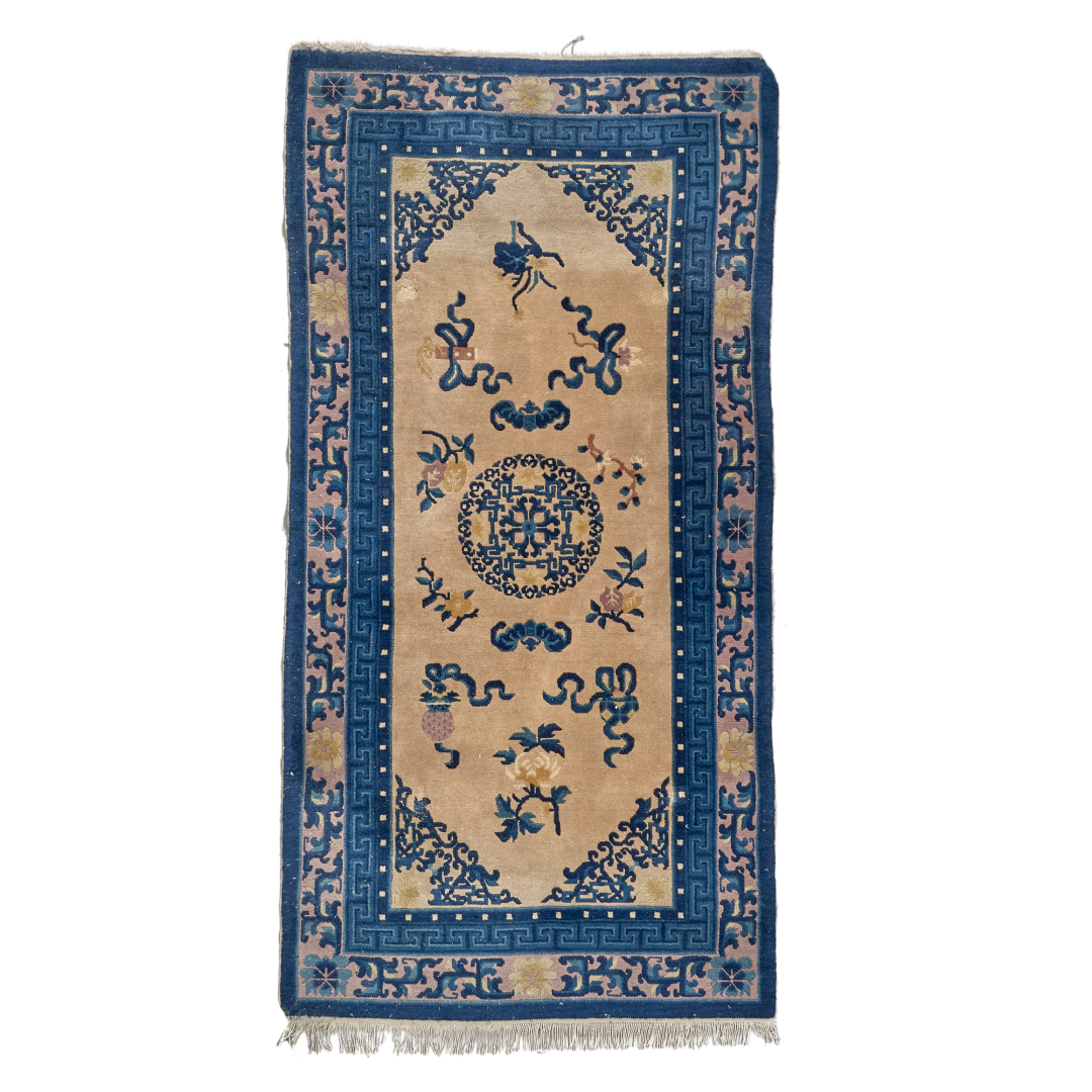 Fondo ocra e decoro in policromia, al centro motivi floreali, pipistrelli e oggetti, entro due bordure, una geometrica e la più esterna floreale.
