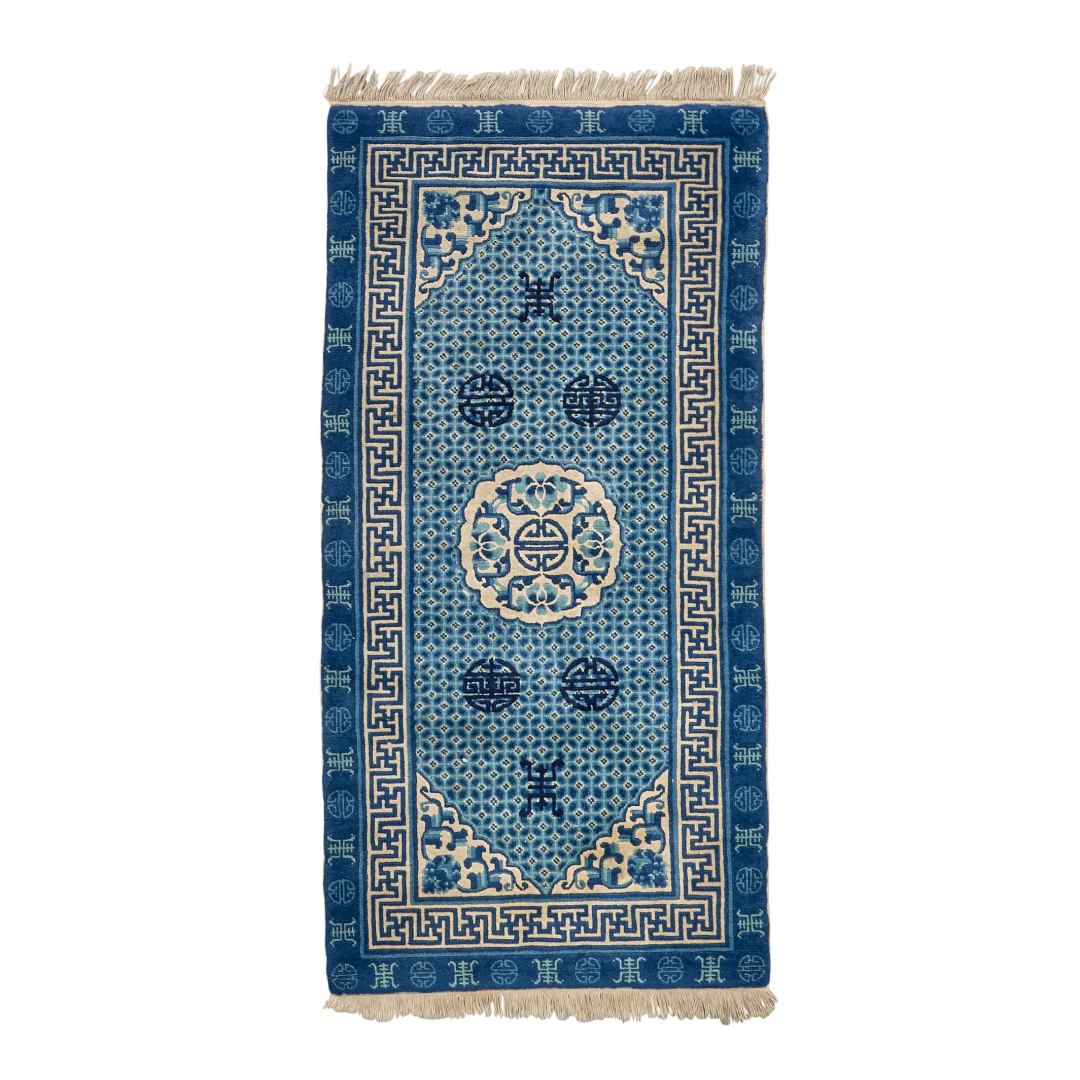 Fondo blu e ocra, decoro geometrico sul quale si sovrappone più volte il carattere shou.