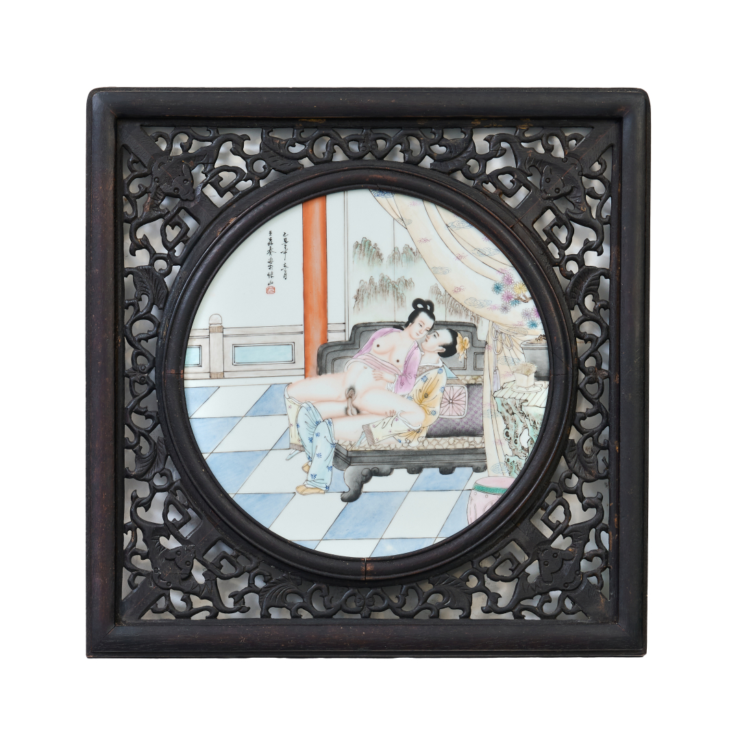 Porcellana dipinta a smalti policromi, scena erotica ambientata in un interno, iscrizione e firma con sigillo in alto a sinistra, cornice in legno intagliato 'a giorno'.