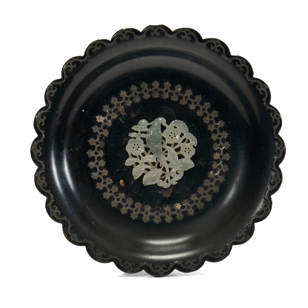 Legno laccato con orlo modellato in sgusci, al centro della superficie a vista un inserto in giada raffigurante un uccello tra fiori racchiuso entro banda circolare con motivi vegetali.