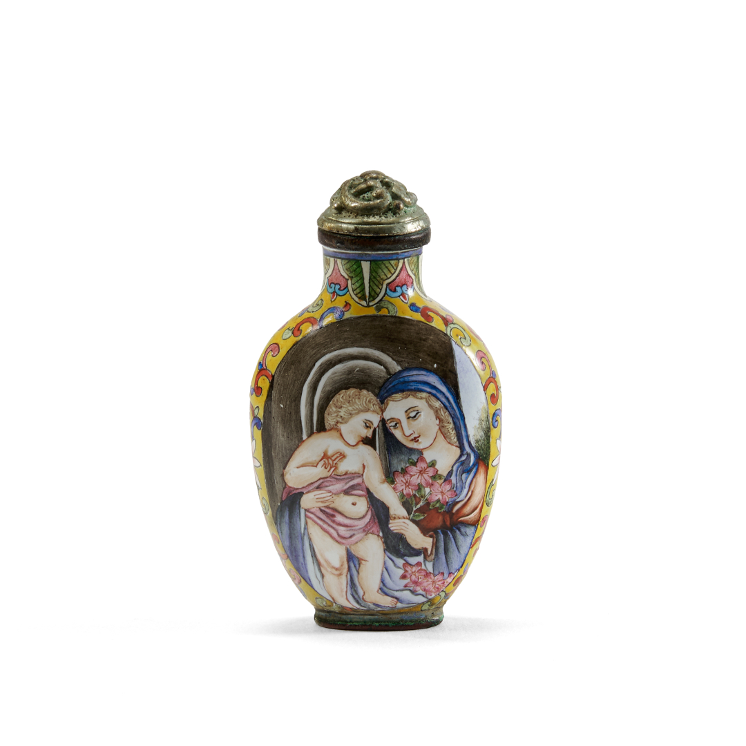 Metallo dipinto a smalti policromi con due versioni di Madonna col Bambino, marchio apocrifo di Qianlong al centro della base.