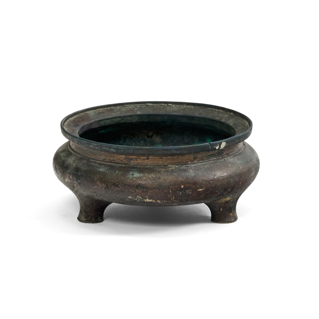 Bronzo, il contenitore sostenuto da tre piedi, marchio al centro della base.