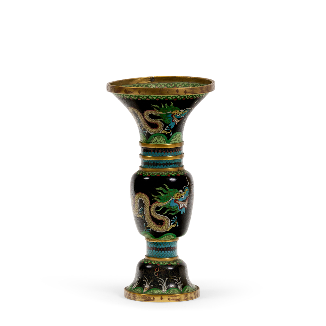 Metallo smaltato a cloisonné in policromia, decoro di draghi e motivi geometrici e floreali.