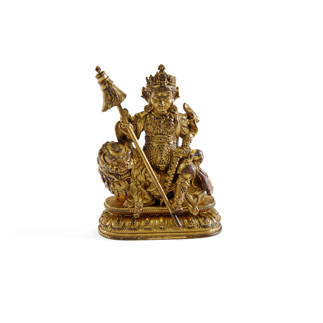 Bronzo dorato, il dio della ricchezza vestito di armatura, seduto in posizione lalitasana su un leone, la mano sinistra su una mangusta, quella destra a tenere un parasole, il tutto su base a forma di fiore di loto, tracce di pigmenti.