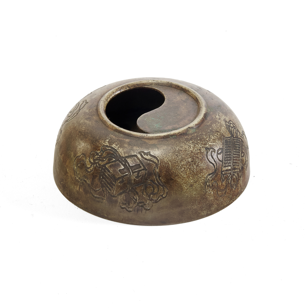 Bronzo, la parete esterna con oggetti beneaugurali incisi, l’apertura modellata come simbolo yin-yang.