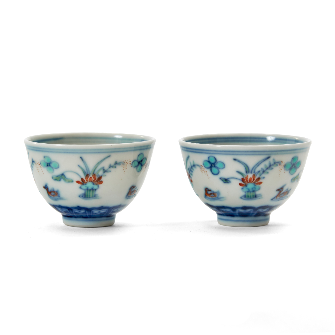Porcellana dipinta a smalti policromi, l'esterno della parete con decoro di fiori e anatre, marchio 清華珍品 (Qinghua zhenping, "Oggetto prezioso, limpido e bello") al centro della base di entrambe.