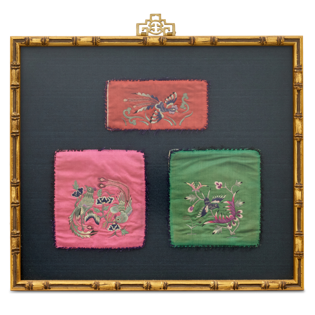 Seta con decoro a ricamo di fili policromi, entro cornice in legno e vetro protettivo.