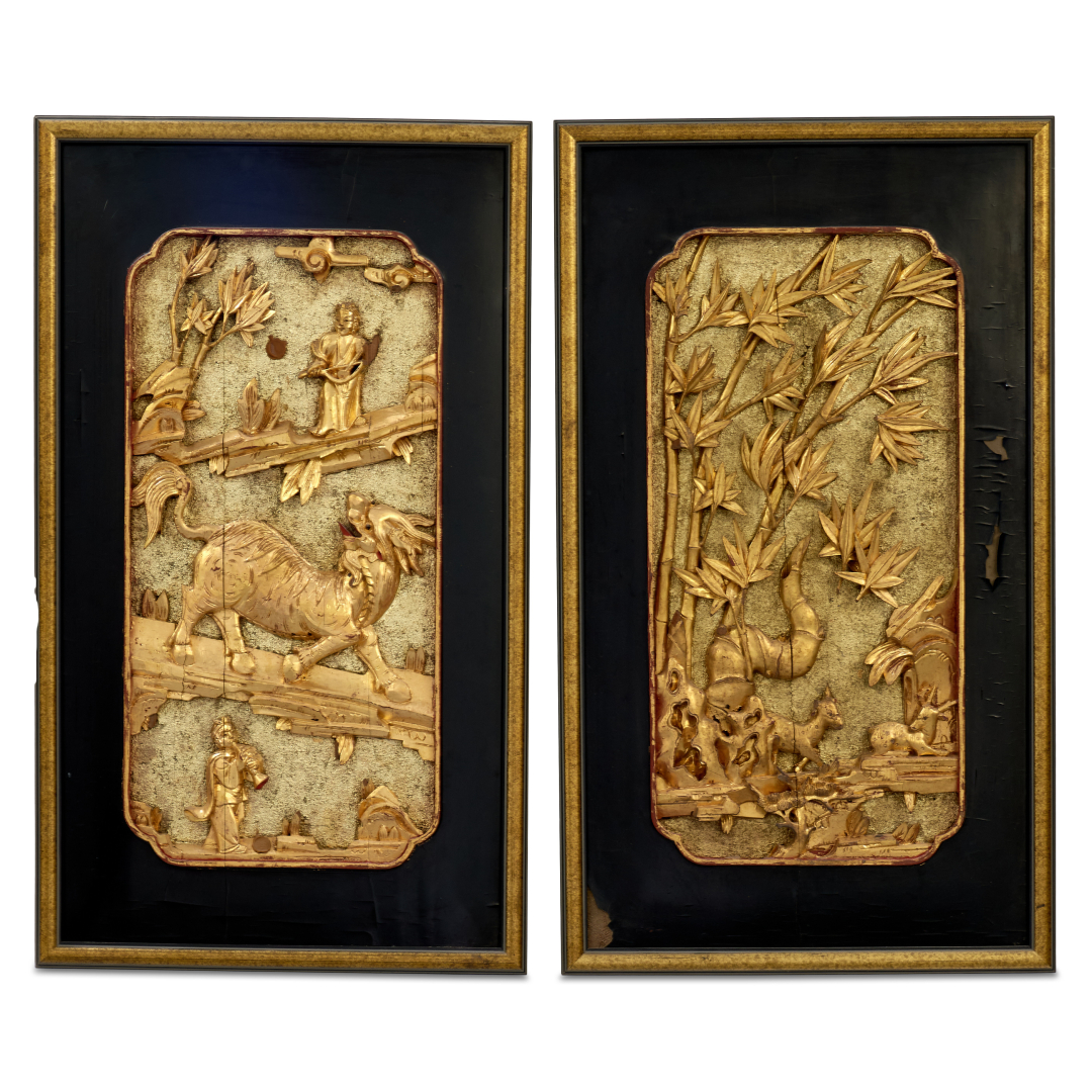 Legno intagliato e dorato, uno con composizione di due daini e fusti di bambù, l'altro con animale mitologico e una figura.