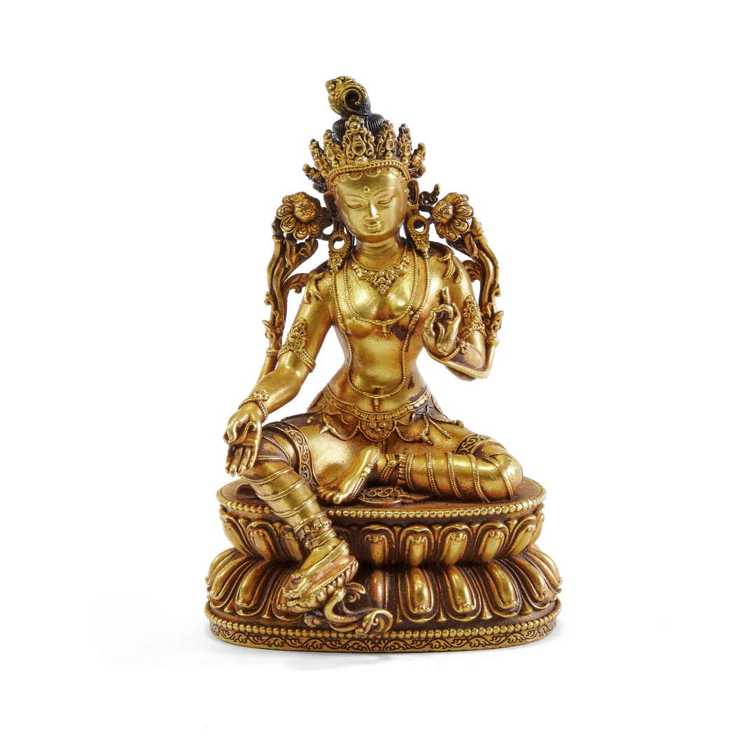 Bronzo dorato con tracce di pittura, la divinità seduta in posizione lalitasana su base a doppio fiore di loto, nelle due mani uno stelo fiorito, la testa coronata e sul petto diversi gioielli.