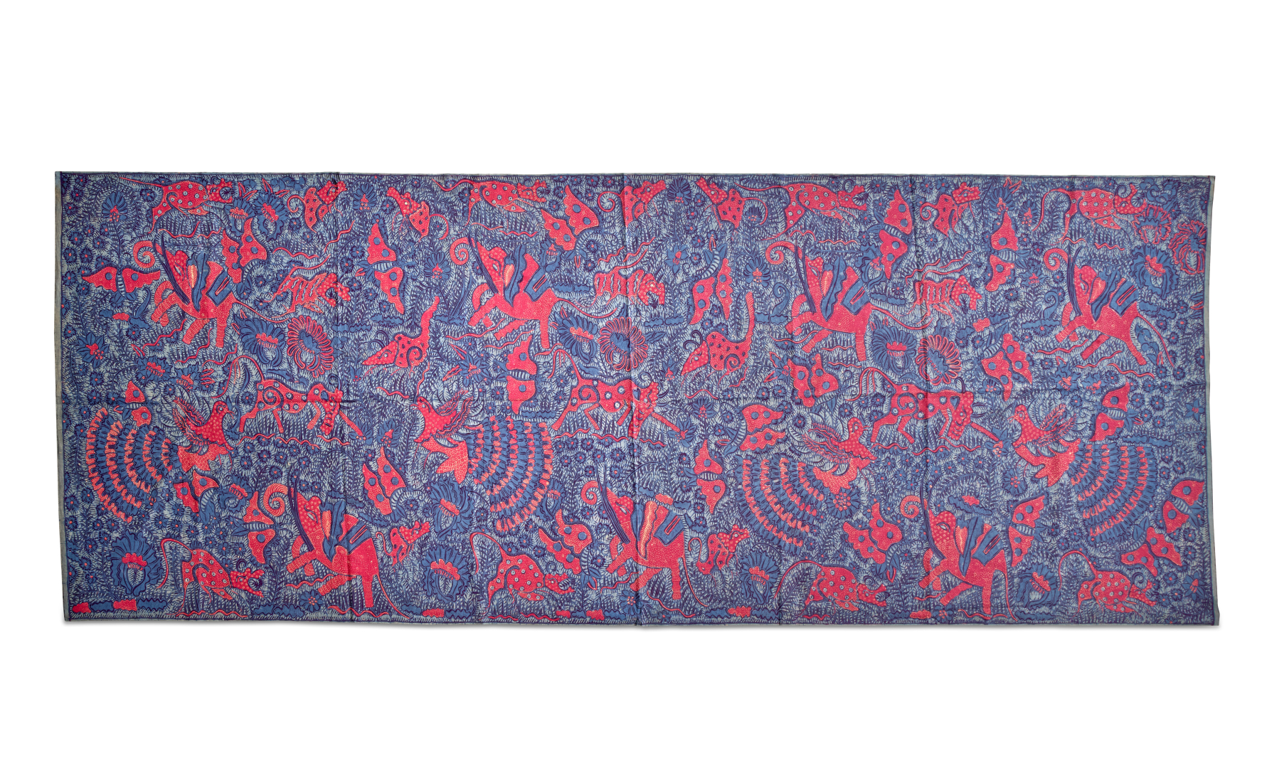 Nei toni del blu e del rosso, decoro di animali e arabeschi stilizzati.