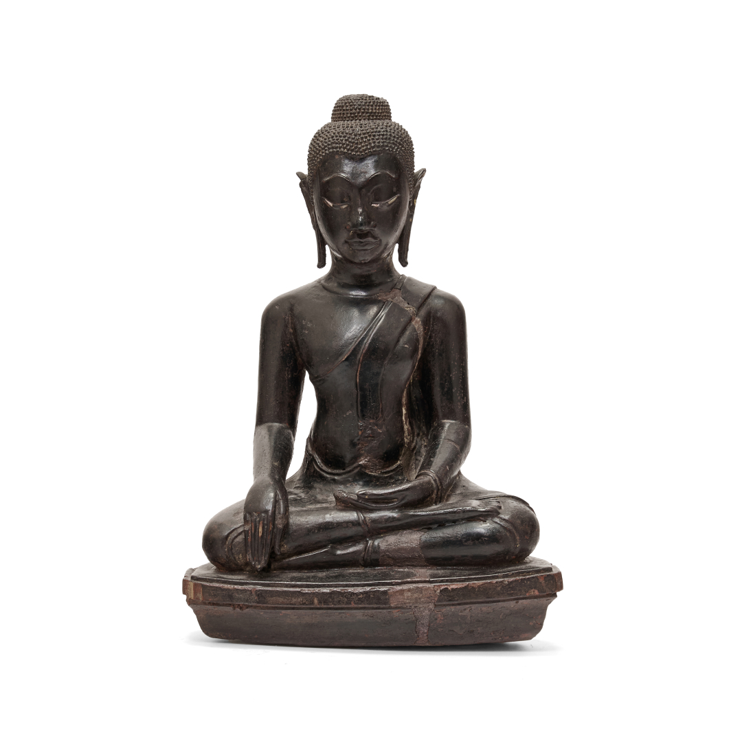 Legno, la divinità raffigurata seduta con le gambe incrociate, la mano sinistra al grembo e quella destra a puntare verso il basso nel gesto della rassicurazione.