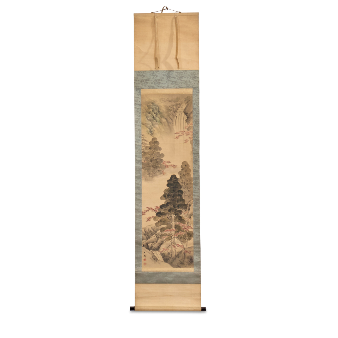 Inchiostro e colori su seta, nel formato del rotolo verticale da appendere (kakejiku), raffigura un paesaggio con alberi, rocce e cascata, firma e sigillo nell'angolo inferiore sinistro.