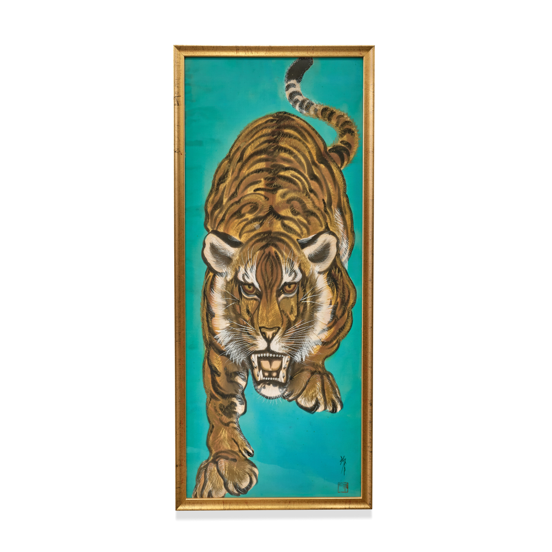 Inchiostro e colori su seta, raffigurante una tigre che incede, firma e sigillo nell'angolo inferiore destro. Entro cornice in legno e vetro protettivo.