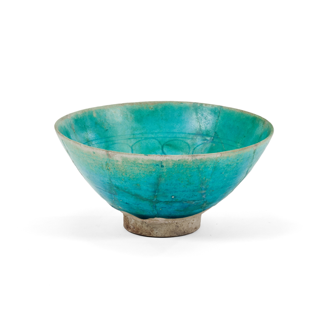 Ceramica rivestita di invetriatura turchese, sul fondo decoro stilizzato a incisione.