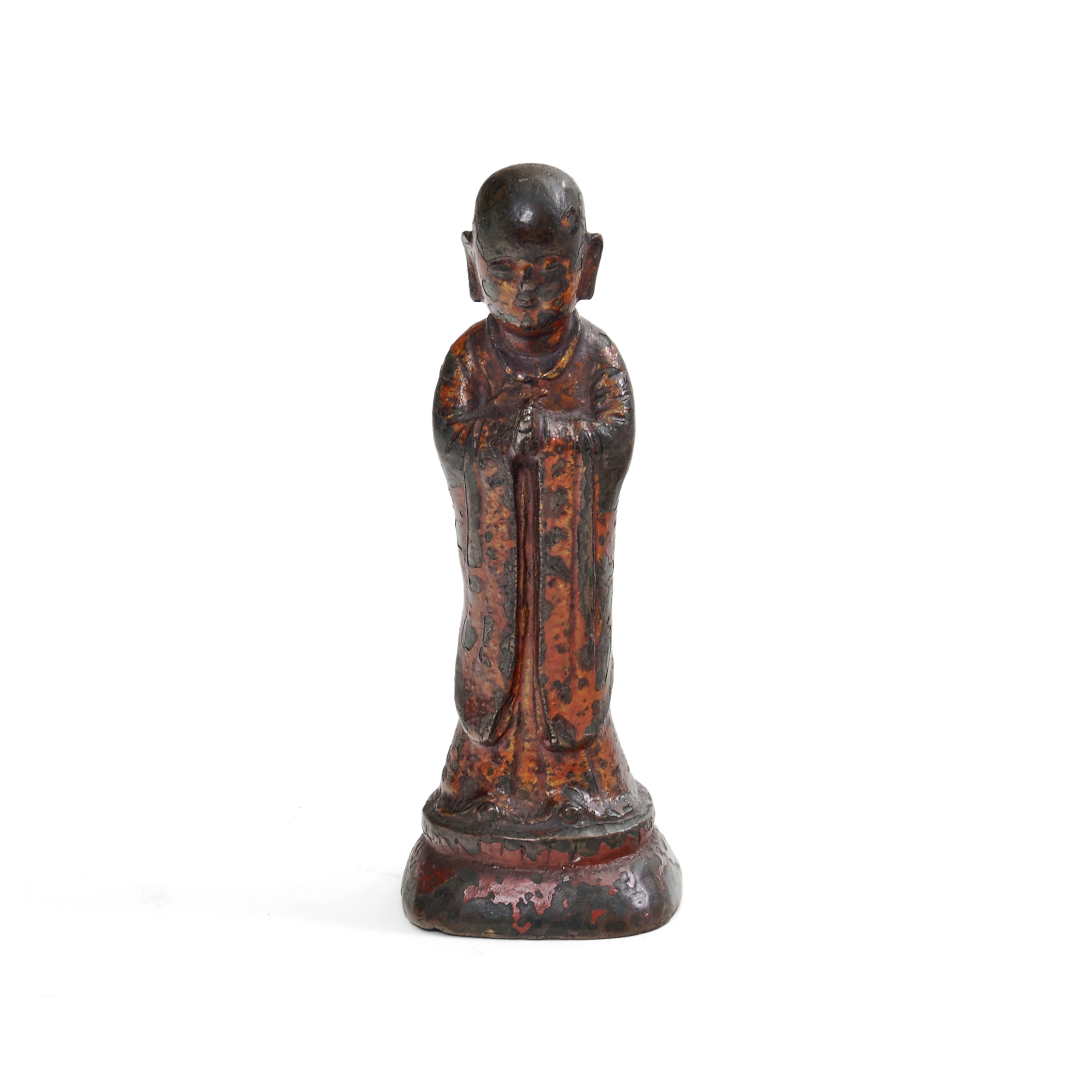 Bronzo laccato, il discepolo del Buddha raffigurato stante con le mani giunte al petto.