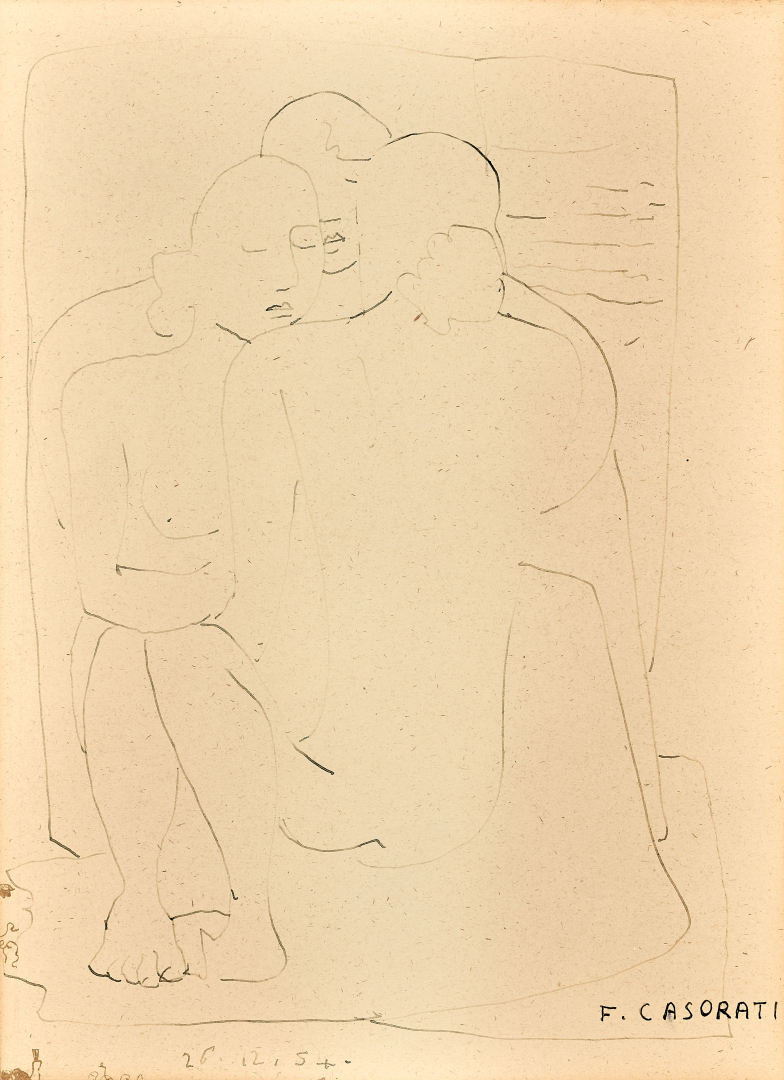 Disegno fatto il 26/12/1954 su tovaglietta da ristorante, al verso, sotto la firma dell'autore, le firme dei commensali tra le quali si riconoscono quella della moglie, Daphne Casorati e del figlio Francesco.