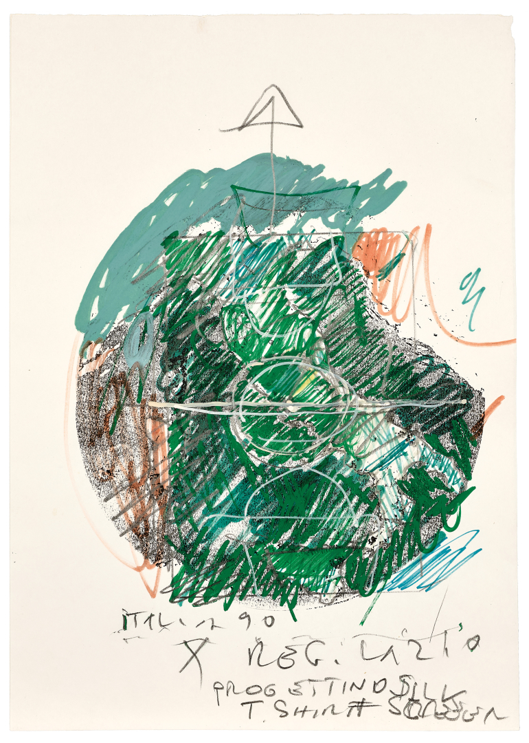 Iscrizione 'Italia 90 x regione Lazio progettino silk T Shirt 1990 screen' al recto in basso a destra.