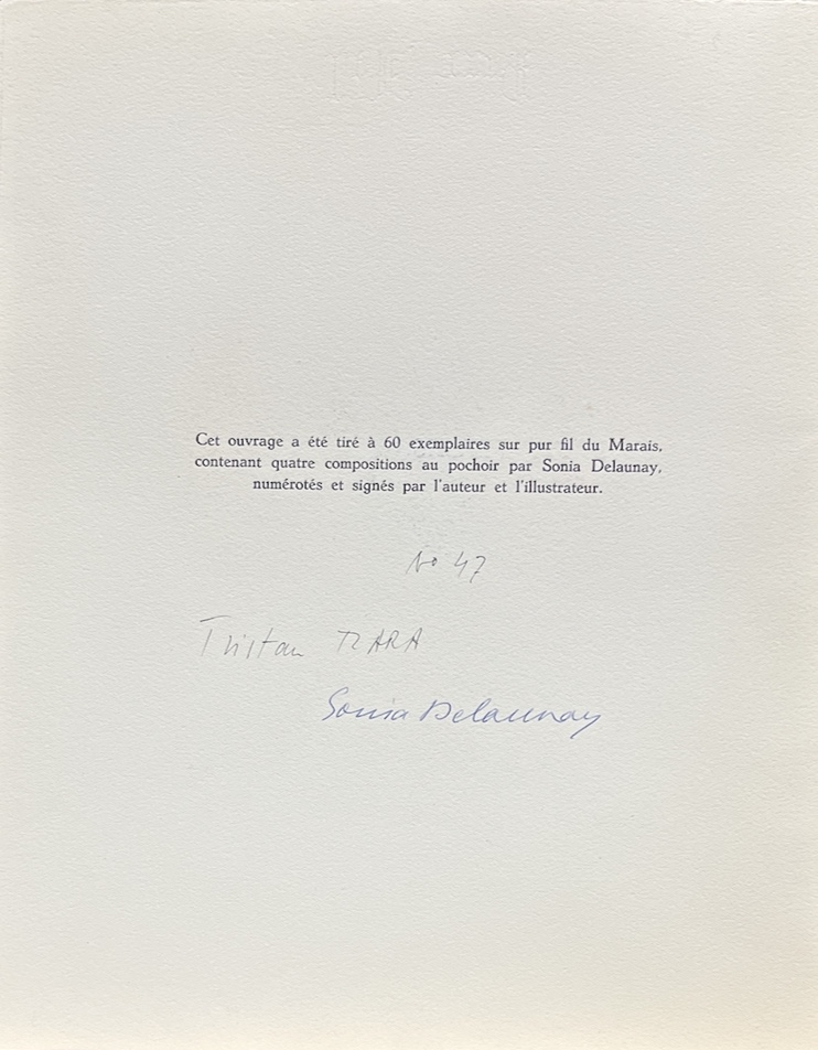Completa il lotto il colophon dell'edizione firmato dai due autorii: Tristan Tzara e Sonia Delaunay e numerato.