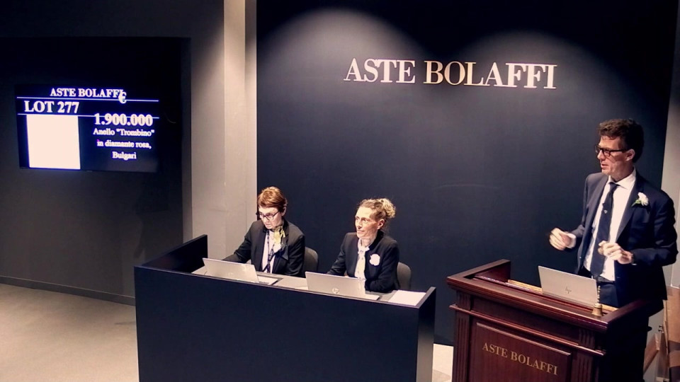 Servizio del TG1 sulla vendita all'asta dell'anello "Trombino" Bulgari, a cura di Anna Milan. Con intervista a Filippo Bolaffi, AD di Aste Bolaffi.
